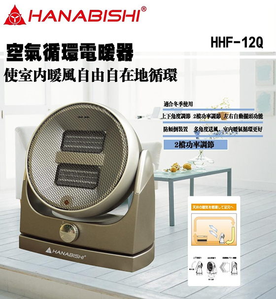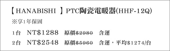 商品訊息簡述: 平均每台最低只要1274元起(含運)即可購得【HANABISHI 】PTC陶瓷電暖器(HHF-12Q)1台/2台,享1年保固。