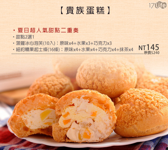 店取:只要145元即可享有【貴族蛋糕】原價240元夏日超人氣甜點二重奏:菠蘿冰心泡芙(10入)-原味x4+水果x3+巧克力x3/紐約糖果起士條(16條)-原味x4+水果x4+巧克力x4+抹茶x4(2選1)。