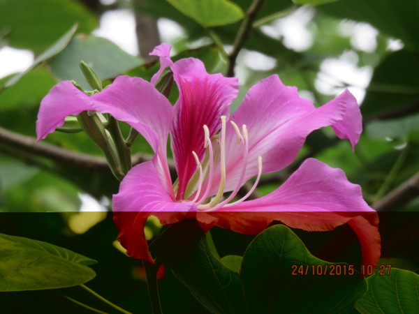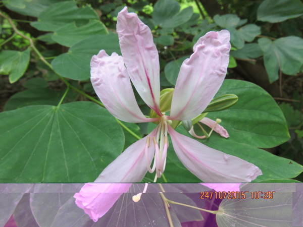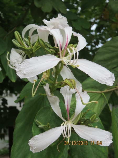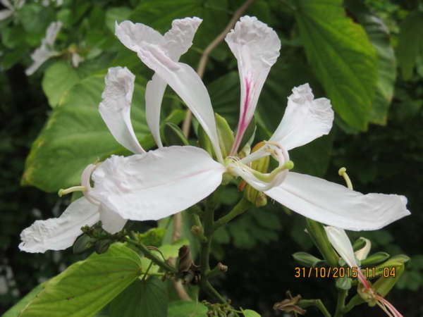 羊蹄甲屬三兄弟:洋紫荊、豔紫荊、羊蹄甲,常令人混淆,目前也正是「洋紫荊、豔紫荊」的開花期,相關的幾個小技巧上網找看看!首先是時間:洋紫荊主為秋天,羊蹄甲則為春天,雜交或嫁接的艷紫荊則由秋天至隔年春天都可以看到開花。這個好認,次要是花期的著葉情形:開花時,洋紫荊及豔紫荊都是滿樹綠葉,羊蹄甲則多為落葉後開花。這要細看。第三為雄蕊數量。最後為結果情形:洋紫荊及羊蹄甲的結果狀況都不錯,艷紫荊則少結果的情形。加減判斷,清大所照為豔紫荊(1)、洋紫荊(2);南大附中所照雖立牌粉白羊蹄甲,但兩岸三地不同地方約定俗成的名稱不盡相同,附中所種其實是洋紫荊(3-4)。