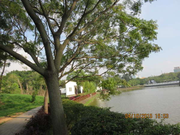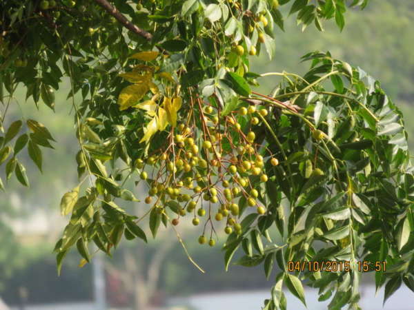 苦楝由於生存能力強、抗旱、耐鹽、耐污染,而又生長迅速、根深而利於水土保持,再加上春天有如薄霧般美麗的紫花、夏天有寬闊的樹蔭、秋天有金黃色的串串果實,冬天落葉前還有變黃的葉色,種種美好的特徵(網路上實在形容的太好了),使其極適合作為造林樹、行道樹、公園樹,現在入秋,我只看到成串的果實垂掛,配合靜心湖景果然相映成趣,更有一家公司的前庭,苦楝子鑲嵌至石塊而生長成迷你株,煞是悠雅。