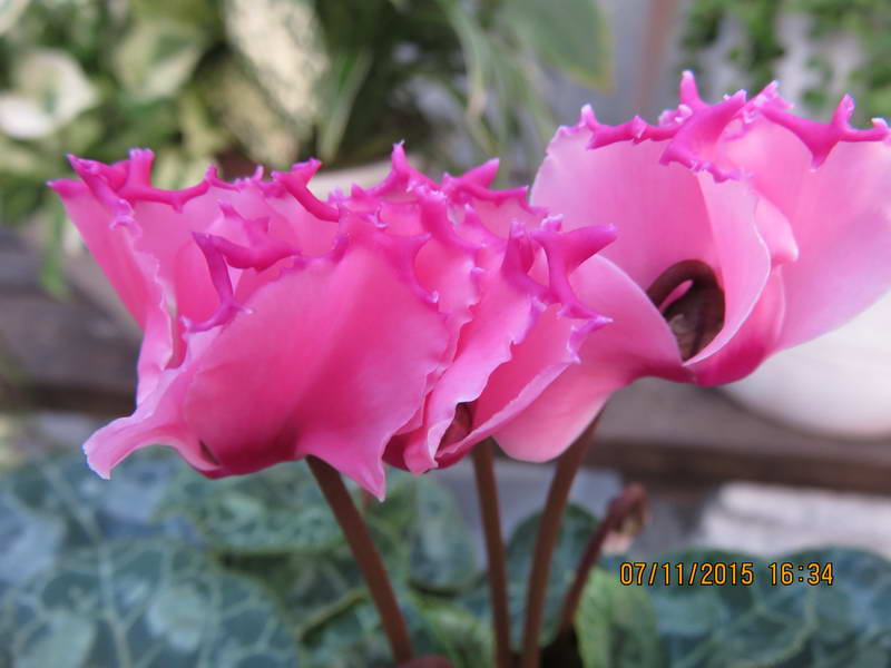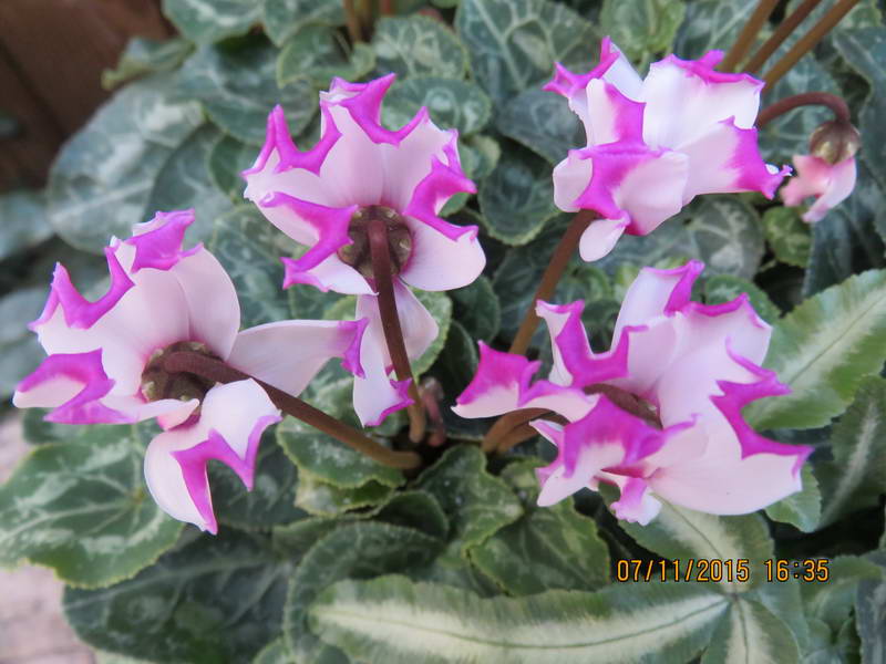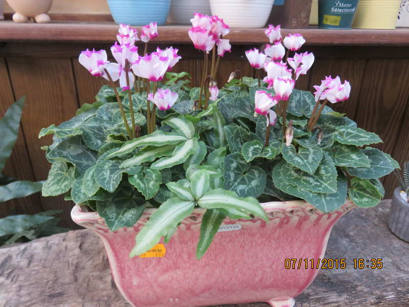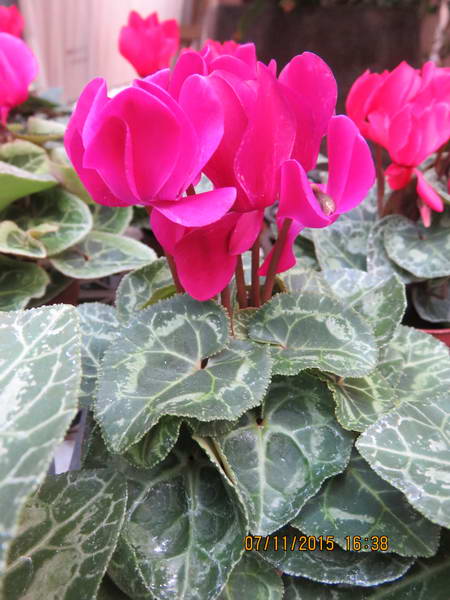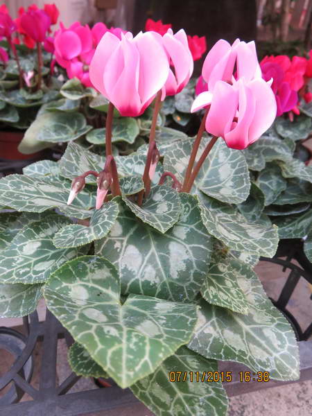 「仙客來」一詞來自學名Cyclamen的音譯,由於音譯巧妙,使得花名有「仙客翩翩而至」的寓意,且花期適逢耶誕節、元旦、春節等傳統節日,過年期間特別受到消費者的歡迎,為農曆年間的節慶花卉之一。心形的灰綠葉片,搭配鮮豔的花朵,色彩上強烈的對比及其小巧玲瓏的模樣,使仙客來深受喜愛,而有「盆花女王」的美譽。仙客來的花朵盛開時集中於葉叢中央,高於葉面,如同蝴蝶翩翩飛舞於葉片之上,嬌俏可人。細看其花色有白、粉紅、紅、鑲邊、絞斑、雙色花等,目不暇給。美麗的彩蝶姿態及繽紛的色彩,怎麼擺放都好看。攝於新竹市區