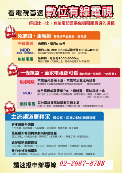 立即享有數位電視服務,獨家好料,共有14台高畫質數位頻道給你看過癮!還享有聯網電視服務、wifi無線分享器,電視大升級,數位生活立即來臨