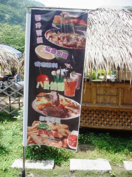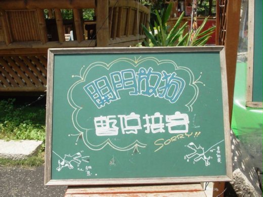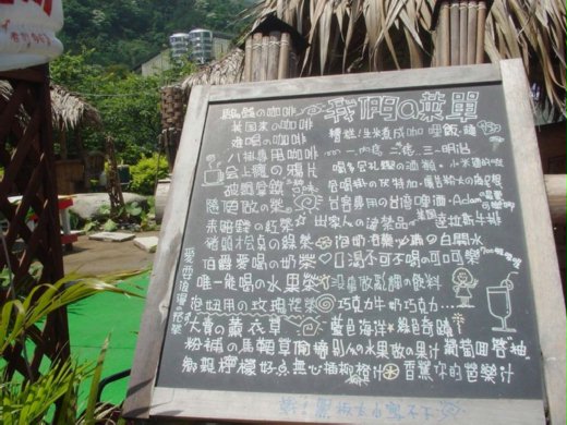 尋找位於橫山民俗文物館前的「快倒閉的咖啡廳」,這間店就是今天我們大家聚餐的地點,是間非常特別的店,店門口前的直立招牌上面寫著「快倒閉的咖啡廳」、「本店專賣 難吃食物 奇怪飲料 燒焦烤肉 退冰啤酒 營業時間 不曉得看心情」,超無厘頭的行銷詞,令人對它不得由衷的好奇起來。門口旁的黑板廣告更是好笑又有趣,一座座用竹片和葉子建成有如包廂的用餐空間也讓人大呼另類有創意,老闆與該店吉祥物更是幽默、健談、搞怪創意滿滿的人,非常好相處。