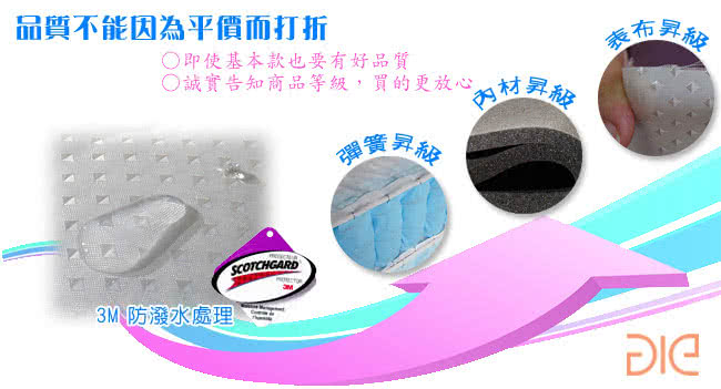 ?. aie 享愛名床 經濟型獨立筒床墊(真三線竹碳+3M防潑水),是基本款的獨立筒床墊之一,但用料的選擇上卻一點都不基本,不論是彈簧、內部襯材、表布到製作工藝,都要比一般基本款的床墊還要好,本款表布經3M防潑水處理,防止水氣滲透造成內部潮濕,表面好清理,但不減其透氣性,我們誠實告知您產品的等級,不會低價品、高價賣,讓您花的錢更有價值也更能為您帶來健康的睡眠。(此款為真三線做工,除了增加內部襯材外,亦隔離內材層和彈簧層,更耐用也更衛生)