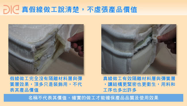 . 晚上睡眠的品質,直接影響白天生活的素質,晚上睡的好,白天不論工作、旅遊、聚會都會有好精神,所以一張好床,絕對是一生中最值得的投資,但床墊的好壞怎麼分呢?難不成店員說了就算?aie享愛名床知道您的困擾,所以我們誠實告訴您床墊材料及製作的差異,讓您能做出清楚且正確的選擇,用最低的預算選擇到最適合自己的床墊。 床墊會以幾線,也就是幾條車縫線來標榜它的價值,所以市面上就有真幾線和假幾線的分別,所謂"真":即表示車縫線有連結了立面和平面的布,目的是隔離材料層和彈簧層,讓內材更穩固,工序較為複雜,材料也比較多,而假線只是在側邊布上多車上一條線,只能說是裝飾用,沒有任何實際效果,雖然外觀上差不多,但做工及床墊的使用效果卻差很多,您可以從側邊往外拉來簡單的辨視。