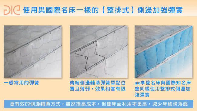 . 床墊最重要的彈簧體,aie享愛名床亦昇級使用整排側邊線徑加強獨立筒,減少睡在床緣會有滑落的感覺,讓床面的使用面積充分發揮,側邊線徑加強的補強方式,是國際知名床墊常使用的方式,也是最實際有用的補強方法,比側邊輔助彈簧效果更好也更長久,而成本也更高。