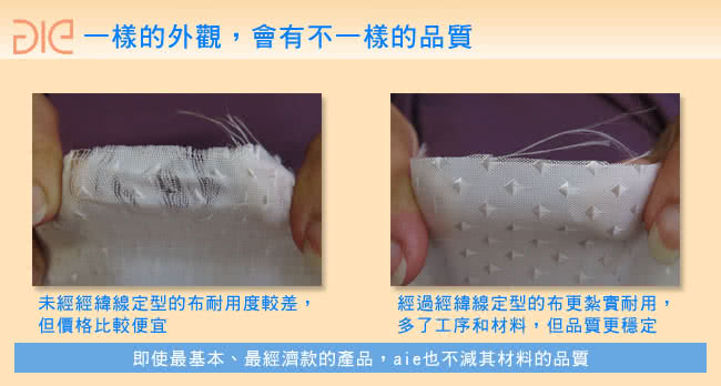 ?. 床墊材料的好壞,消費者其實很難分辨的出來,同樣一塊外觀、質感一模一樣的布,有沒有經過定型過程,效果及耐用度就差很多,價格當然也有差異,aie享愛名床堅持,即使是最經濟型的布,也要有一定的品質,即使是最經濟型的床墊,當然也要符合健康及實惠的標準。
