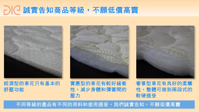 . 每個人都希望花的每一分錢都是值得的,所以我們即使最基本款的床墊,在同樣的價錢下都要做的比別人更好,而且不誇大,讓您清楚了解買到的是什麼樣的商品,照顧您的健康也照顧您的荷包,這是aie享愛名床給您的承諾。. (我們並未在內材層數上多加介紹,因為那會誤導選購方式,如為了穩定車花材料的不織布也算一層,或包裹彈簧的也算一層,但其實並沒什麼意義,所以國際品牌床墊,.即使特別詢問,也不會告知內材層數,就是不想讓消費者誤以為層數越多越有價值)