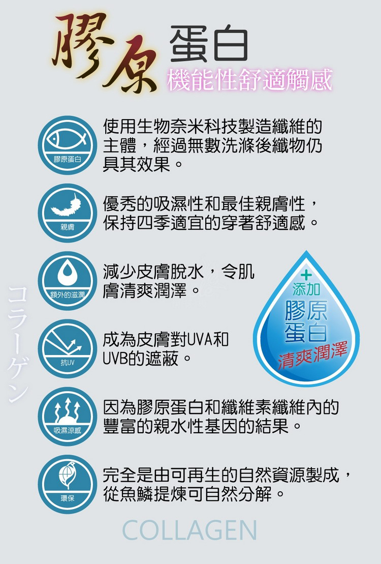 舒適泡棉添加獨家膠原蛋白,貼近肌膚,清爽潤澤、吸濕排汗,是最佳親膚纖維。