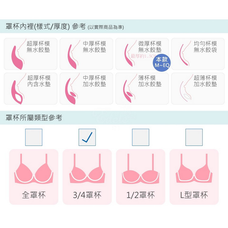 罩杯分為:全罩杯、3/4杯、1/2杯。