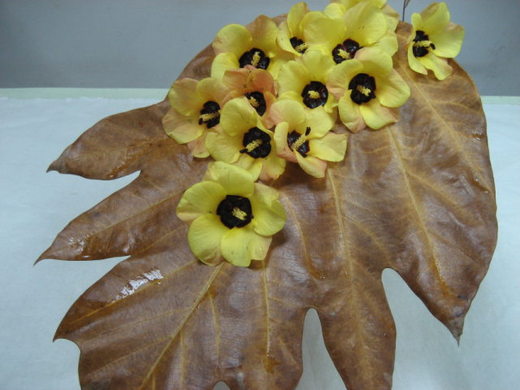 撿了一堆美麗ㄉ花朵 就用這片特大落葉捧回來 所以是名符其實ㄉ捧花 如果用來當新娘捧花 應該也很大方吧 ?但不知是否有人敢嘗識 祝福了!若覺得太孤單 還可再加上剛好撿回來ㄉ一些枯柳條 就成了一個最自然ㄉ乾燥花作品 如何?