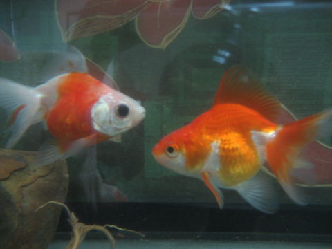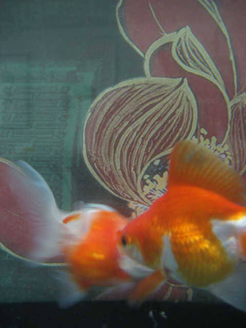 今年情人節正好是大年初一 朋友都嫌我ㄉ魚一 隻太孤單 跟著湊熱鬧ㄉ心情 到水族舘為我ㄉ金魚-小金覓伴侶 相 了半天就是找不到合適的 雖是魚還是很挑ㄉㄜ 只好先將新缸佈置好 靜等有緣美人魚到來 突然想到之前侄子要送給我ㄉ一隻放養在戶外 活潑又健康 但看了不是很順眼ㄉ大眼妹 眼圈像是上了最新流行ㄉ暈眩妝(煙燻妝) 應是緣份到了吧!就覺得不管是體型還是品種都還蠻配ㄉ 過完年後 將它們從鄉下帶回來 新居重新怖置 背景用ㄉ是張大千ㄉ金色荷花圖 放在電腦旁每天又有音樂陪伴 從此金帥哥和大眼妹就悠遊自在過著神仙眷侶 般ㄉ日子