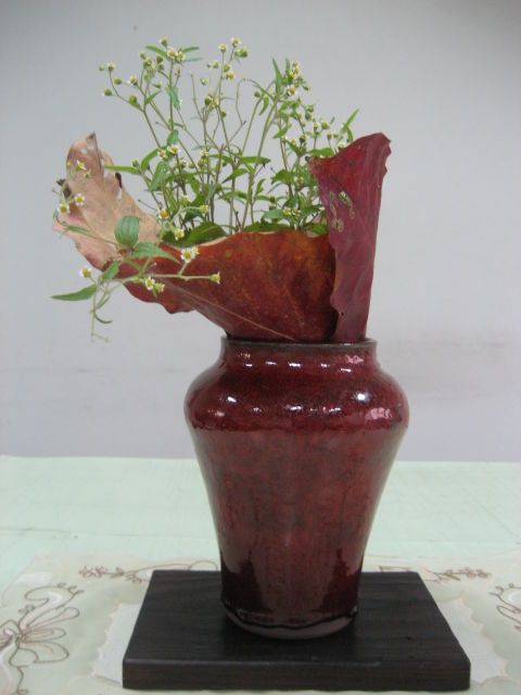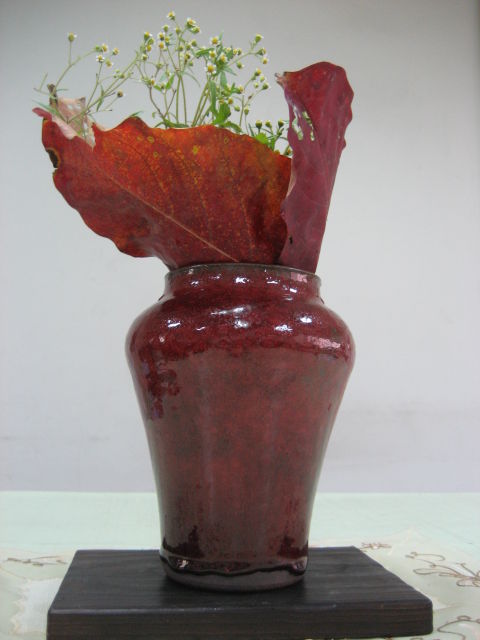 過年包了個紅包 給侄子 他回贈了 一隻銅紅ㄉ花瓶給我 顏色非常美麗 應該是比較滿意ㄉ作品吧!常問我插花了沒效果好不好 因瓶子顏色太漂亮了 有點捨不得用 早上撿回來ㄉ三片紅葉 天然ㄉ顏色竟然和瓶子顏色那麼相似 設計了個簡單ㄉ花型 渾然天成 效果真是雅極了 呵呵!不好意思自己誇 謝謝國強ㄉ好作品