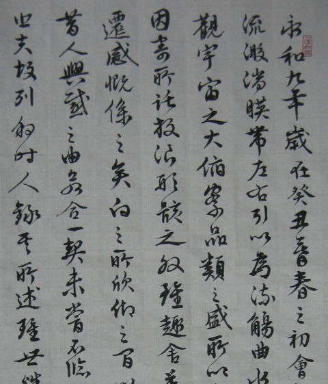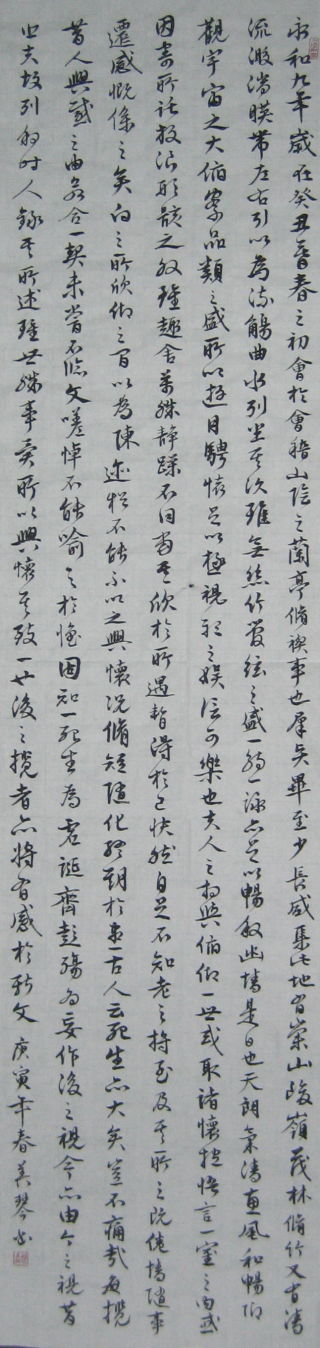 其簡釋即 「人與人相處於世上 轉眼便渡過一生 有的人將自己的抱負 與友人在室內敘談 有的人借外物寄託情懷 無拘無束地生活 處世態度千差萬別 或恬靜 或浮躁 各不相同 但如對於所遇之事物感興趣 心裏暫時得意 先欣然自足 就會忘記衰老將要來臨」 今逢農曆三月初三 正是當年蘭亭聚會 舉行修契儀式 之日 秀 一下拙作 緬懷古人