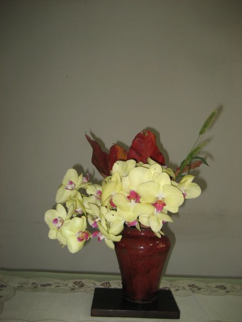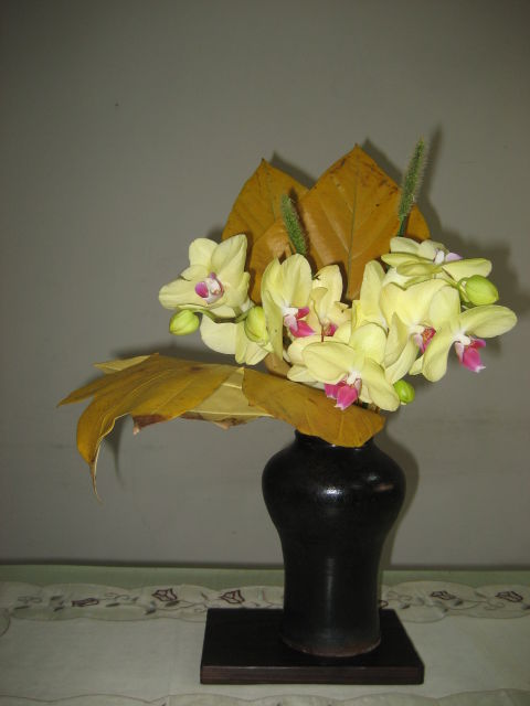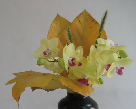 慶幸生在台灣寶島 堪稱花卉王國 這麼漂亮黃色蝴蝶蘭一把才賣50元 忍不住買了紅.黃兩把 又隨手捻了幾片黃葉 毛毛蟲野草幾根 配上鐵黑色花器 就是一件好看作品 朋友羨慕隨手撿來葉子 都能欣賞 其時只要認真用點心 泥土也可變黃金