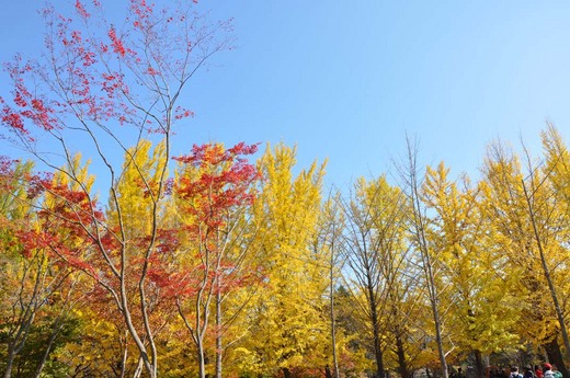 在車站前,招了計程車便往渡輪碼頭去了。(車資大約3600韓幣上下,約台幣一百多元)來到售票處(渡船來回票&門票的套票,八千韓幣)就發現滿滿都是人等著排隊中。售票服務處的旁邊有賣玉米&地瓜,超好吃的。在等待渡輪的路上,發現了 I Love Taiwan 的旗幟,真是超感動的。進了南怡島後,整個島上有許多的銀杏樹與楓葉,可惜還沒有全紅,多數仍是翠綠。南怡島也許是因為韓劇冬季戀歌在此拍攝的關係,很多遊客都會來找相關的景點。往島內深處走去,發現了一處鐵路彎道;鐵道的一旁就是整排的銀杏樹。繼續沿著鐵道走到一處水池旁,往左邊跨越鐵道就是廁所的方向。如果想照相的人,站在此處搭配整排的銀杏樹,藉由鐵道的延伸,讓模糊的背景來突顯人像,那就更有美感,是個不錯的取景角度。一大夥人席地而坐,享受著從便利商店買來的零食與餅乾(也許台灣真的沒有賣,總覺得韓國的很多零食超好吃)。看著銀杏隨風飄落,彷彿下起了黃金雨,灑在步道的人群,真是美啊。眼前也剛好有一群小朋友跟著老師做戶外教學。看他們玩的很開心的樣子,真的有那麼好玩嗎?害我也想跟著去玩了。(小朋友的書包排列的超整齊喔,不會亂丟。這是台灣的幼教所沒有提倡到的)