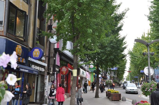 到了梨花大學校門口,就發現好多大學生趕著準備上課。(梨花大學是女子大學喔,所以我發現了好多的靓妹,不過我沒那個膽去搭訕就是)校門口那條上坡的街道就是商圈了,也是有許多複合茶坊與餐廳的咖啡街。可惜因為大家團體行動,所以沒時間去喝咖啡。一走進校園內,發現了一個建築非常有特色,從山坡中間挖了一條大長廊,然後再以階梯逐漸往上爬。在大長廊兩旁的山壁中,設計了圖書館,視聽室與餐廳等等的規劃,這種樣式我在台灣還真沒看過。走出了大學,已經是早上十點半了,校門口街道兩旁的商店也都開始營業。由於這個商圈也賣了很多女性服飾,想當然的,同行的女同事又開始購物了。可是早上沒吃,肚子快餓扁了。聽布萊恩說,這邊附近有一家賣三明治早餐店,其中的牛肉總匯三明治非常美味(我不曉得韓文怎麼稱呼這個口味,所以就用我的理解直接命名了)。於是就給布萊恩一個機會,去向女大學生詢問一下這家三明治店在哪。原來,出了校門口朝著正對面那條兩旁有行道樹的商店街走去,遇到第一個巷子左轉就看到了(在綠色招牌的咖啡坊旁邊而已,三明治早餐店的招牌是紫紅色的,名稱為Isaac)。