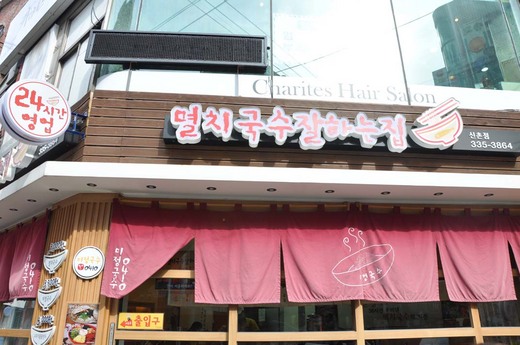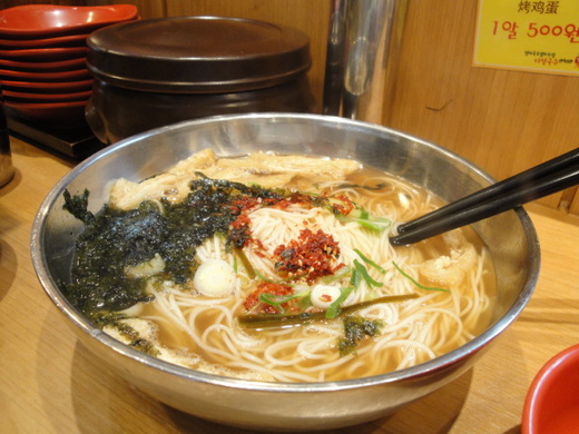 算算時間,都已經中午十二點了,怎麼大家還意猶未盡的在逛街購物啊?該不會不吃中餐了吧?!果然,被我料中。因為大家又開始血拼了,可以購物而不吃飯,所以中餐就取消自理囉。聽到這個消息,我心中可真是非常不爽,都講好了要去吃中餐的,結果就只忙著逛街。早知道就約不想逛街的同事去吃就好,都已經買了四天了,連最後一天也不放過血拼啊!真是夠了!於是,我們幾個不買東西的同事開始亂逛,逛回了接近新村捷運站附近的三角公園,就只發現了一家麵店。(這條是燒烤街,所以中午都還沒開門營業)正在猶豫要不要吃時,突然一個女大學生跟他的同學說,這家的麵很好吃喔。(剛好這句韓文我有聽懂,畢竟是韓劇常常出現的台詞嘛)所以二話不說,便領著同事進去吃了。不過尷尬的問題來了,店員都聽不懂英文,該怎麼辦?於是觀察了一下來店裡吃飯的學生,原來角落有一台點餐機,類似我們去中華電信繳費一樣的操作介面,是觸控面板的。每一道菜都有圖片介紹並有英文翻譯,一眼就知道大概是什麼樣式。所以我們就點了幾道最多人點的餐點,分別是(我只知道英文,韓文不懂囉)anchovy noodles + It is warm and soy sauce based guksu + anchovy rice ball + meat rice ball。就這四道菜四個人交換吃就飽了。真是美味啊!不過到了中午時間也是要排隊的喔。