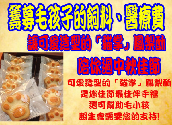 讓可愛造型的『貓掌』鳳梨酥,陪著您渡過中秋佳節,產品毫不添加人工香料,防腐劑,給您最高的享受,又可做公益慈善,救助更多陌頭受傷的毛孩子。