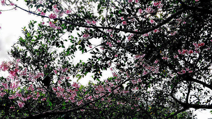進入花園新城上坡路邊,一排綻放的寒櫻,開得好美。