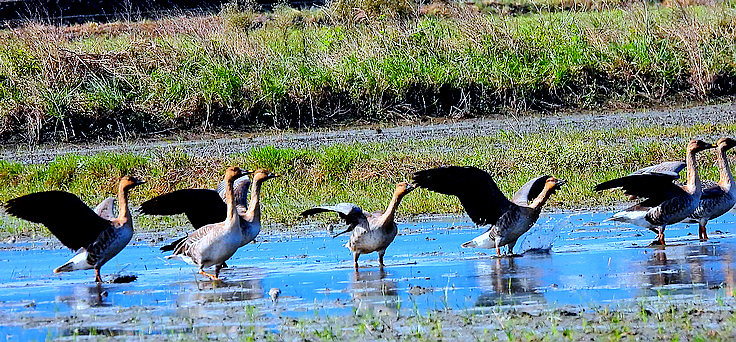 宜蘭壯圍,出現一群豆雁、白額雁,屬於台灣稀有冬候鳥。