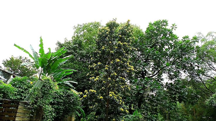 黃金蒲桃,花期全年,但盛花期約每年11月到次年2月,如逢士林官邸菊花展期正好開花,花團錦簇,同樣吸晴;有一說,遠看仿佛一個個憨態可愛的熊貓臉,因此又有「金黃熊貓」的別名,是花色特殊的珍奇花木。