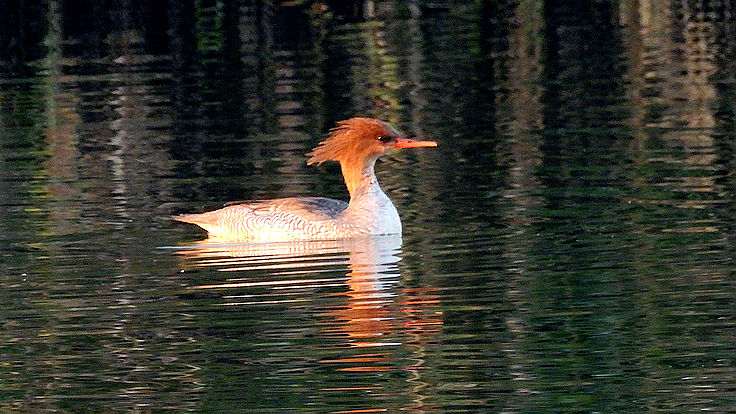 「唐秋沙」翅膀羽毛本是淺灰色,被落日餘暉映照呈淺橘色,