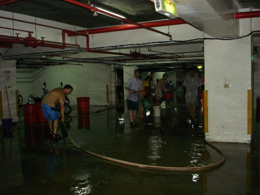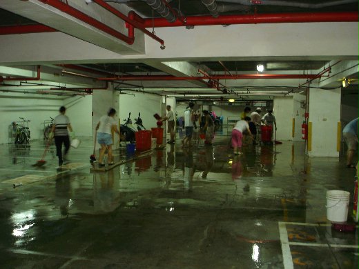 忙到中午後,社區提供便當給幫忙清潔的住戶!! 其實,忙了一個早上已經累壞了!!不過,只把污泥雜物清除,還有剩下地板仍有混著黃泥的積水!!直到五六點鐘,終於清理完畢!!看到原是髒亂的地下室卻變換然一新無比乾淨的地板。