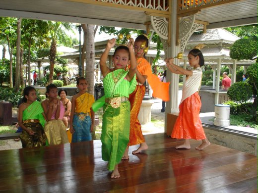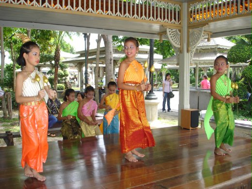 一曲跳完,順手接過幾個觀光客捐給他們一點零錢,臉上顯出平常的表情,淡淡的微笑,圈動著嘴角。沒有因為拿到多、拿到少而顯出不一樣的表情,他們自然坐回到樹下休息,靜靜悄悄的的、無動無聲的,泰國人總是這樣給人摸不透的感覺!