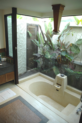 房間內,精緻優雅的白色大床上面還用兩三朵蘭花點綴著,床架詩情畫意的白紗垂帳,真是浪漫極了!近乎露天的泡澡缸,透明的落地窗玻璃外,遍滿美人蕉等熱帶植物。趕緊沖澡,洗去今日的疲憊,讓後躺在軟綿綿雪白色的大床上好好休息一下。