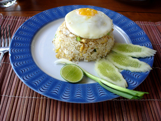 真想躺久一點,不過已錯過午餐時間,肚子饑餓難耐。已經沒體力走到渡假村外的路邊攤吃飯,沒辦法省錢了,只好在飯店臨海邊的餐廳點了最便宜的蟹肉炒飯,一盤一百多泰銖,雖然稍貴,但非常好吃。讚~