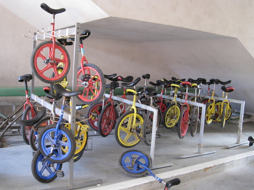 樓梯轉角下 設置專用的一輪車和踩高蹺架