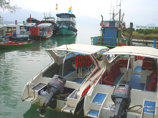 日出,從碼頭後方的 Klong Phrao Beach升起;日落,就在柴切海角 Klong Phrao Beach 海灘的最北邊隱沒。地圖上標明這裡就是 Klong Phrao Beach 的起點,約數家的潛水公司在柴切碼頭前經營泛舟及環遊小島的一天tour;當然旅行社也都有安排套裝類似的旅遊行程。停泊的小船,每天會載客前往南方小漁村Bangbao鄰近的小島。