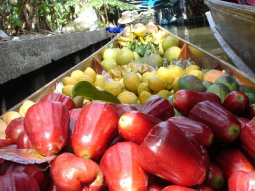 這是哪裡呢?受到國際旅遊攝影沙龍視為受寵之地,任誰都很難不會瞪大眼睛,看著這小船上五顏六色的熱帶水果,香蕉、鳳梨、柚子、楊桃、芒果、荔枝、龍眼、紅毛丹、蓮霧。這一艘一艘小舟,一個個戴著寬邊斗笠的婦女們坐在僅寬一公尺的狹長舢舨上,等著你來!載著新鮮的蔬菜、水果、鮮花、肉食、土產,或是當地的手工藝品,還有賣麵食湯麵呢。