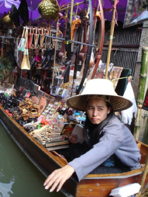 小舟在河面上緩緩沿著兩岸的土產藝品店划進。這櫛次鱗比,出售各色精美的名產,您真得要好好殺價,從一半殺起,可能更低價,你也可以交易成功