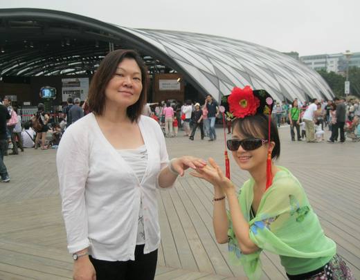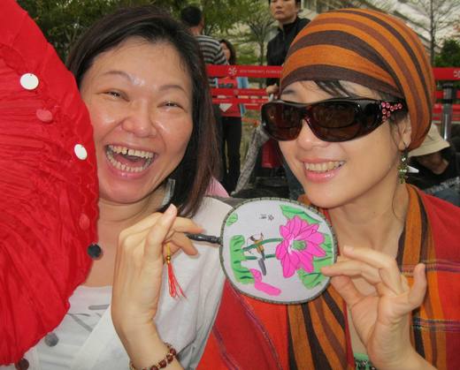 pic3 一點半排隊看優人神鼓,已經排到看4點半那個場次了...等待入場還得好幾個小時。我們席地而坐,嫌著也是嫌著......我開始一件件拿出我的法寶來把玩拍叫....除了格格帽,還有飄扇&丸扇...還有泡泡槍.....karen看我這咖夠怪...簡直樂不可支..