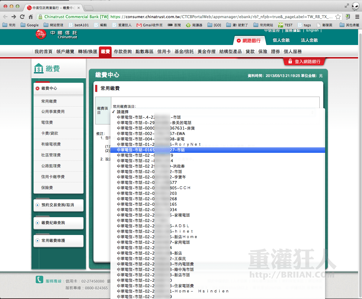 剛剛看到 PTT 上網友提供的資訊,台灣最大的民營銀行「中國信託商業銀行」的網站竟然出現疑似個資外洩的狀況,在中國信託銀行網站「繳費中心」頁面中的「繳費項目」選單拉下來,裡面有一堆姓名、電話號碼、手機號碼、身分證號碼、信用卡卡號、人壽保險號碼、交通違規罰款編號、車主身分證字號、出生年月日…等重要的個人資料與各種資訊,很顯然的這不是我的,而是不知名的第三方客戶,估計有五萬七千多筆,這些資料完全不用登入網站就可以看得到。