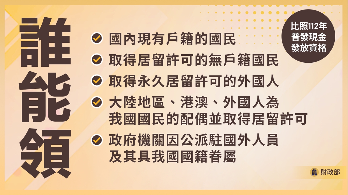 財政部表示領取資格方面,除現有戶籍國民,另包括取得台灣居留許可的無戶籍國民;取得台灣依親居留、長期居留許可的大陸人民;外國人為國內現有戶籍國民的配偶,取得居留許可者。