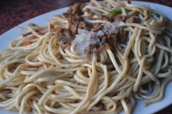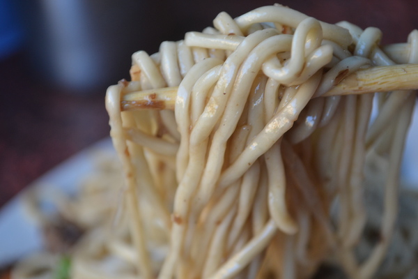 炒麵用快速爐,一口大鍋,開了最烈的猛火。呼呼作響的爐子,很快把大概二尺大的黑鐵炒鍋燒紅,這時候才下油。油遇到熾熱的鍋底,著火燒了起來然後老闆才下爆香料。你看,這火大到燒了起來,不是一般炒麵店能做的。一個二尺(或許更大點)大大的鐵鍋,一次只炒五斤的油麵。下了蔬菜、麵,快速翻炒,老闆只加了一點點的水與調好味道的湯汁,然後起鍋。
