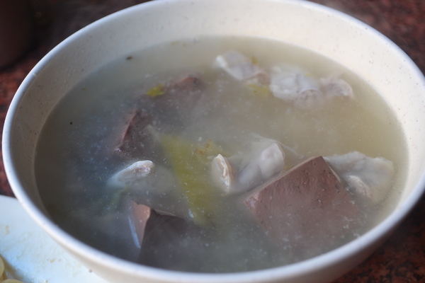 湯也單純,一鍋豬雜湯頭,粉腸、大腸、隔間肉、豬血任你選。用了大量的酸菜一起熬煮,讓湯頭染上了隱約的酸香,特別開胃。豬下水都煮得軟嫩適中,既軟嫩,又不過爛。