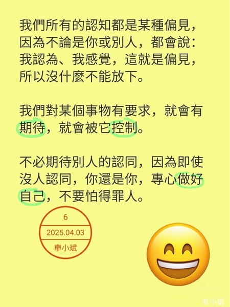 認知皆帶偏見,放下執著,不為期待所困。專注自我,無需他人認同,無懼得罪,活出真實。