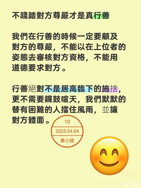 我們在行善的時候一定要顧及對方的尊嚴,不能以在上位者的姿態去審核對方資格,不能用道德要求對方。