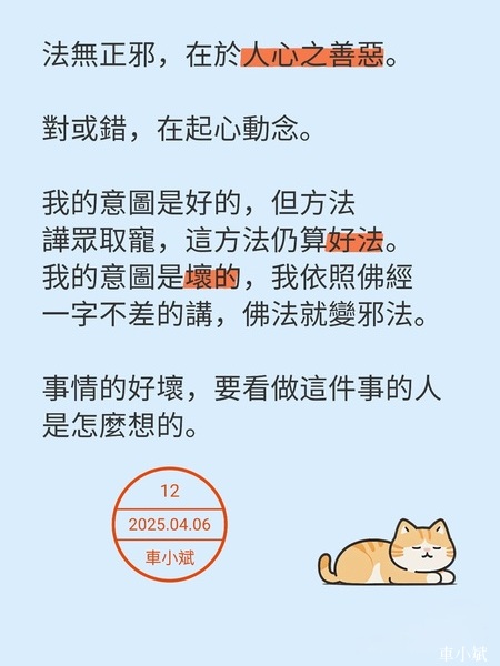 我的意圖是好的,但方法譁眾取寵,這方法仍算好法。我的意圖是壞的,我依照佛經一字不差的講,佛法就變邪法。