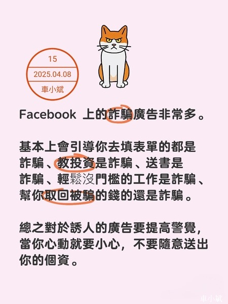 Facebook 上的詐騙廣告非常多,基本上會引導你去填表單的都是詐騙、教投資是詐騙、送書是詐騙、輕鬆沒門檻的工作是詐騙、幫你取回被騙的錢的還是詐騙,總之對於誘人的廣告要提高警覺,當你心動就要小心,不要隨意送出你的個資。