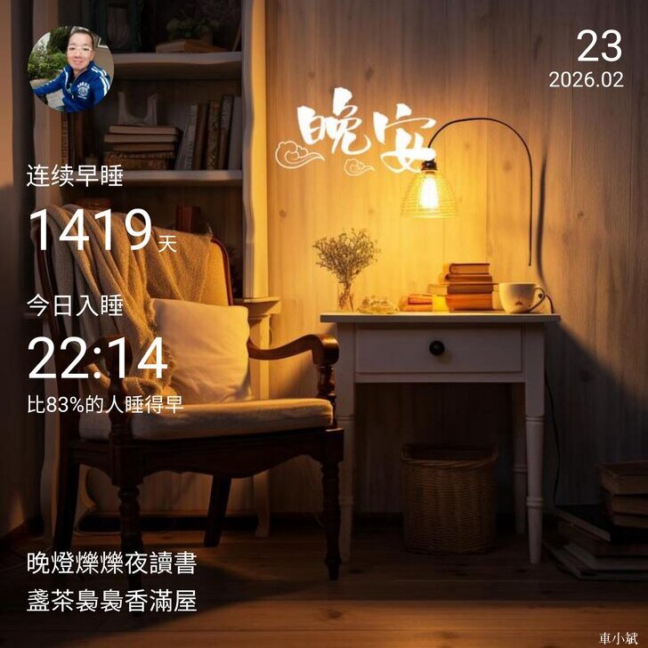 ⬆️晚安打卡圖,2026.02.22,晚燈爍爍夜讀書,盞茶裊裊香滿屋
