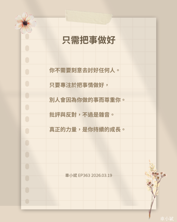 最重要的,不是去理會那些批評與反對,而是把精力放在提升自己。當你把事情做好,當你展現出專業與努力,尊重會自然而然地跟隨而來。把事情做好,就是最響亮的自我介紹。