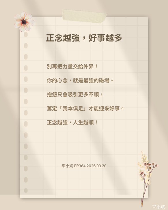 好事絕對不是天外飛來,而是源自於我們積極專注的心念。正念不僅是一種思維方式,更是一種生活態度。當我們在日常中練習正念,專注於圓滿與善意,生命自然會回應更多的美好。
