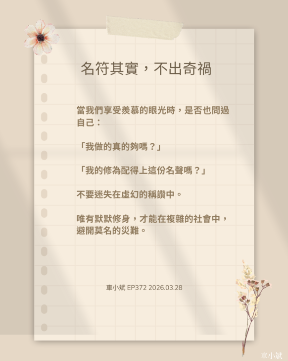 每個人都渴望「成名」,渴望在社群平台上獲得成千上萬的點讚與追隨。然而,身為一名傳遞善知識的教育者,我常提醒學生:「不享世名,修身明德,名符其實,不出奇禍。」