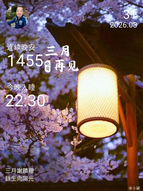 ⬆️晚安打卡圖,2026.03.31,三月謝餽贈,餘生向陽光