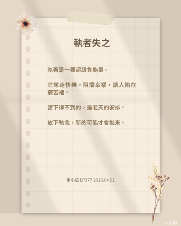 千萬不要執著在一件事情中不出來,它只會讓你失去的更多,而且對於事情沒有任何的幫助。道德經有四個字,叫「執者失之」。